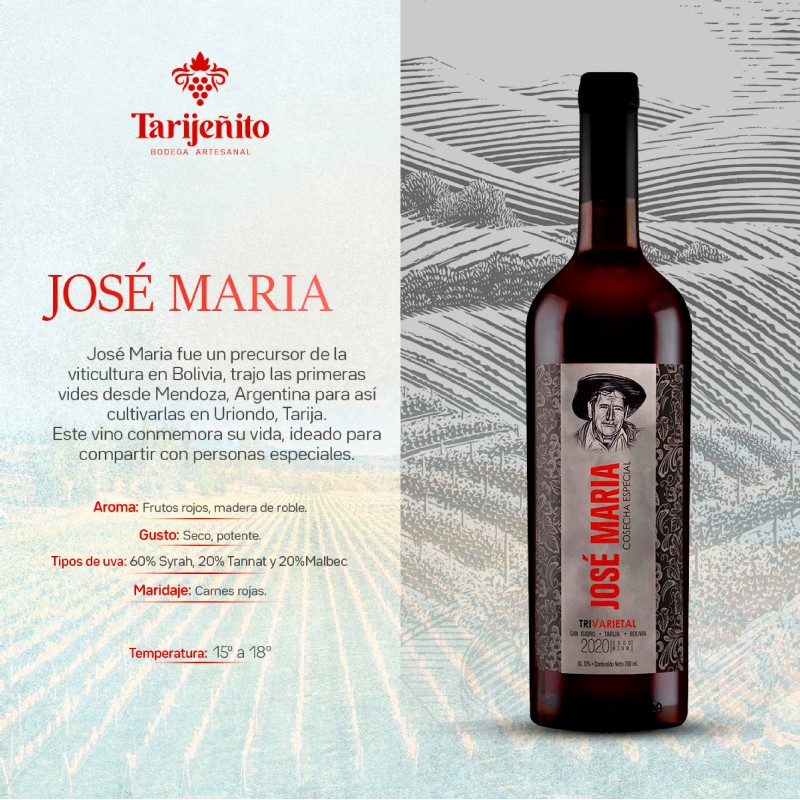 José Maria fue un precursor de la viticultura en Bolivia, trajo las primeras vides desde Mendoza, Argentina para así cultivarlas en Uriondo, Tarija. Este vino conmemora su vida, ideado para compartir con personas especiales.