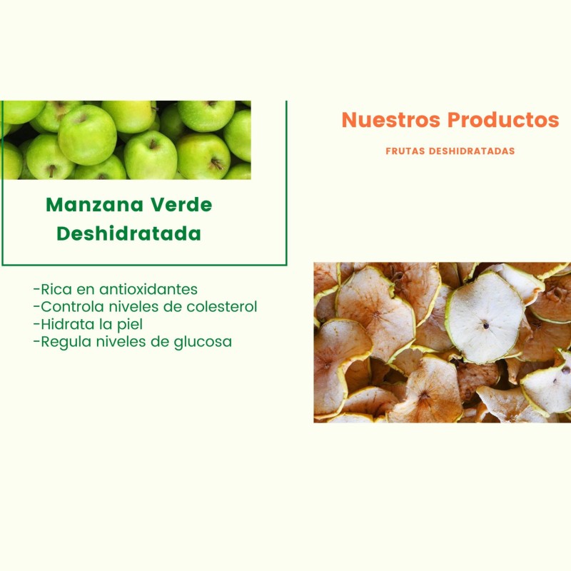 La manzana verde deshidratada es rica en antioxidantes, controla niveles de colesterol, hidrata la piel y regula niveles de glucosa.